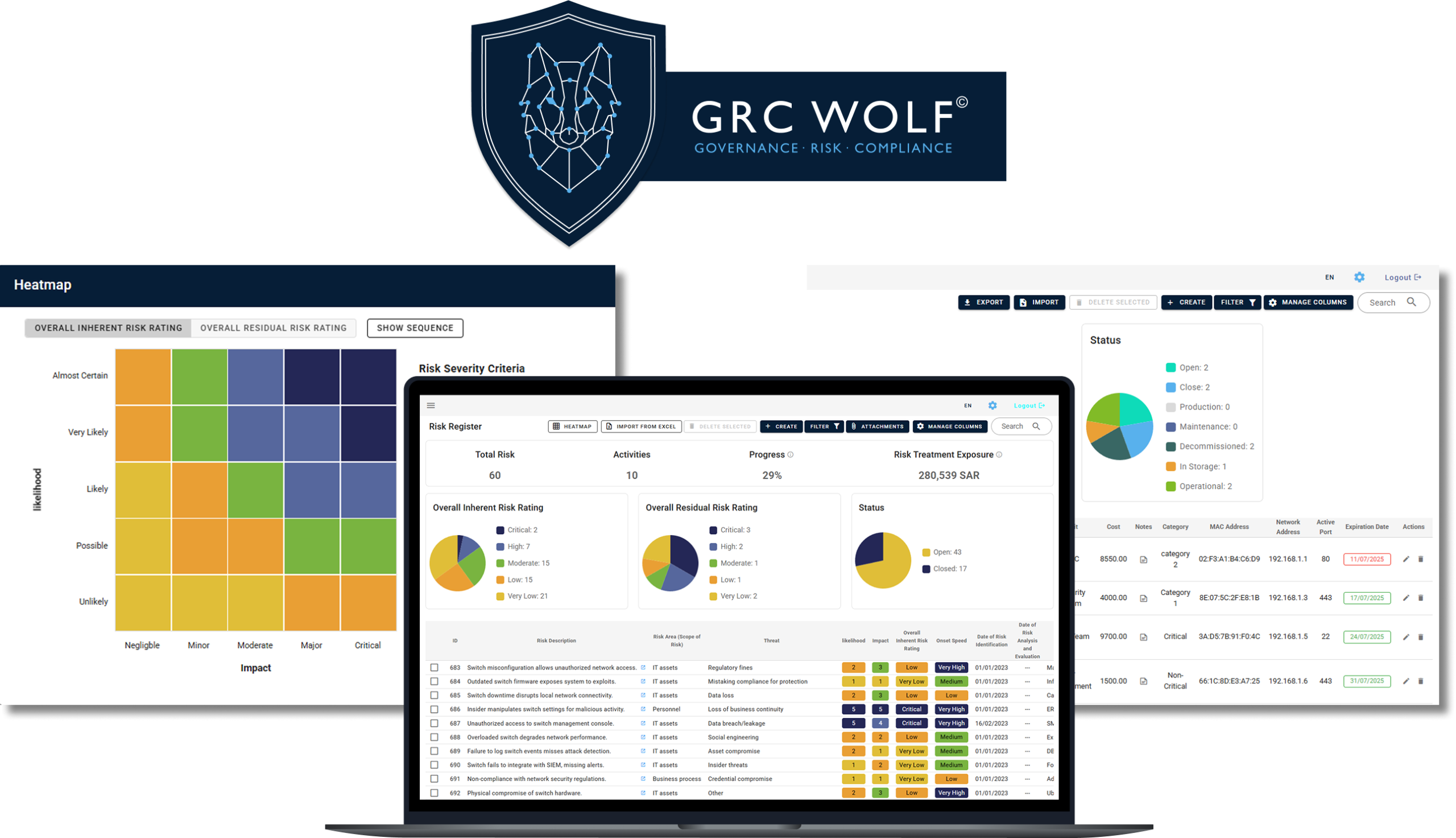 GRC WOLF is our powerful Governance, Risk, and Compliance platform, built right here by our team of regional cybersecurity experts. We created it to give you complete control over your security, helping you manage everything from policies and assets to risks all in one place. With native support for Arabic and secure local hosting in the Kingdom of Saudi Arabia, GRC WOLF is designed to meet your specific needs and keep your data safe, sound, and compliant.